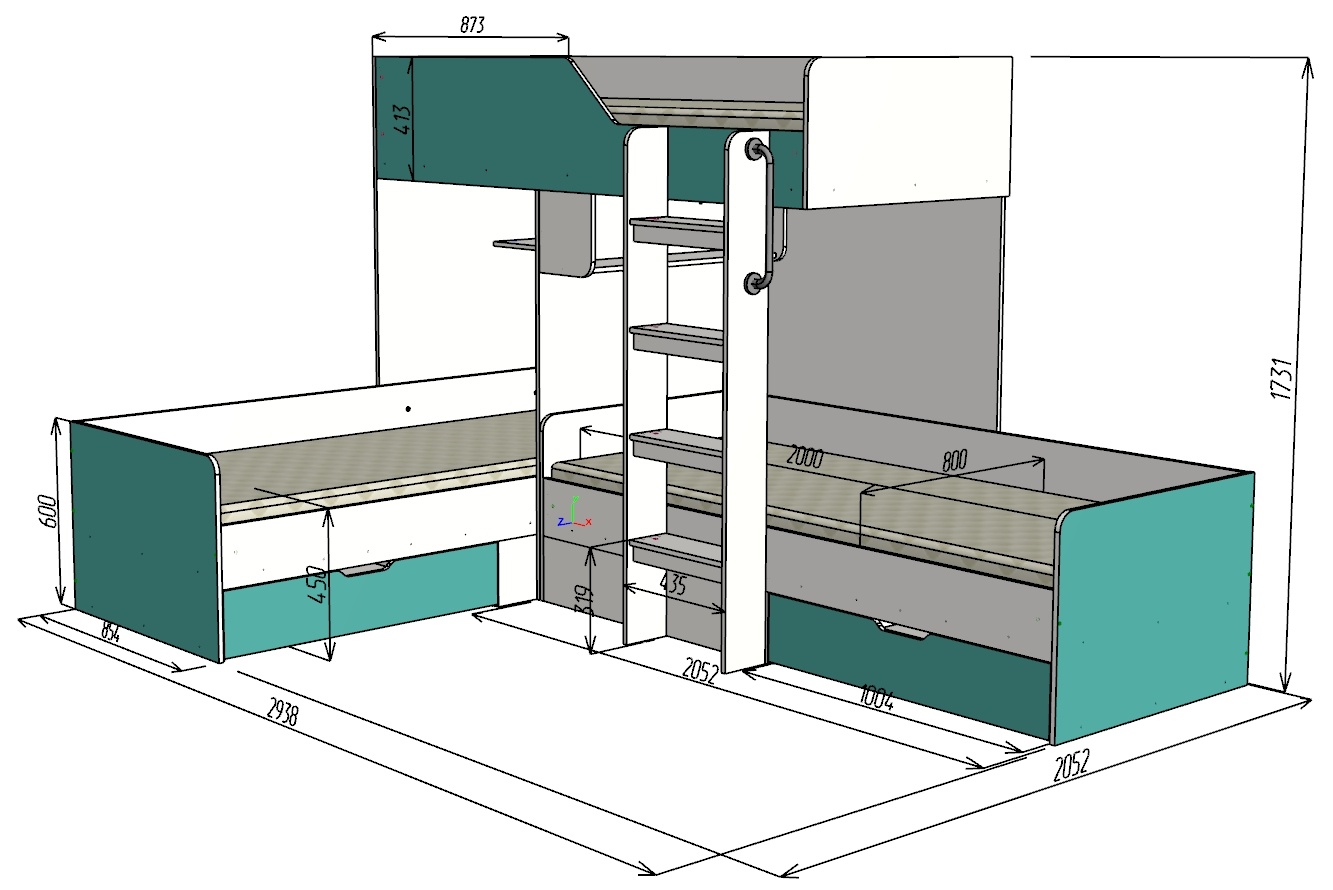 Спальное место верхней кровати - 2000х800ммИсполнитель не несет ответственности, в случае изменения размера помещения после услуги замера.